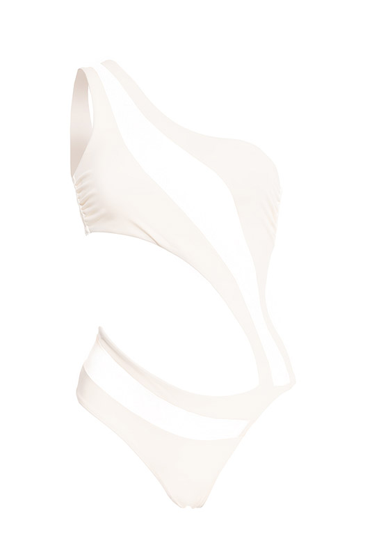 Designed with a geometric, one-shoulder cut-out silhouette, Pharos redefines the classic one-piece with audacious angles, dramatic negative space and sheer tulle panels that tease just enough. Ultra-soft French interlock fabric meets illusion-soft tulle, creating a tactile contrast that hugs curves, sharpens lines and celebrates femininity with fearless precision.